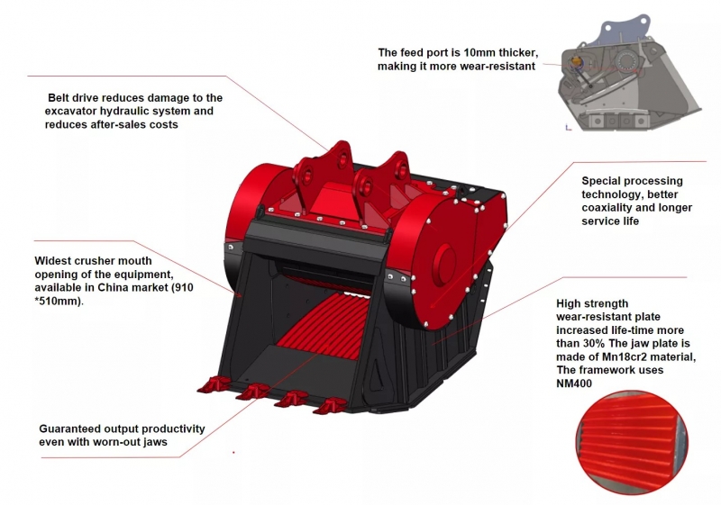 Jeho spôsob práce spočíva na vedre s dvoma drviacimi čeľusťami vo vnútri, jedna z nich je pevná a druhá je poháňaná motorom priamo a pohybuje sa tam a späť vzhľadom k nemu, má jedinečný, agresívny obrázok-osem drvivý pohyb, ktorý produkuje vysoko kvalitný kubický produkt, čo umožňuje opätovné použitie agregátu na mieste.